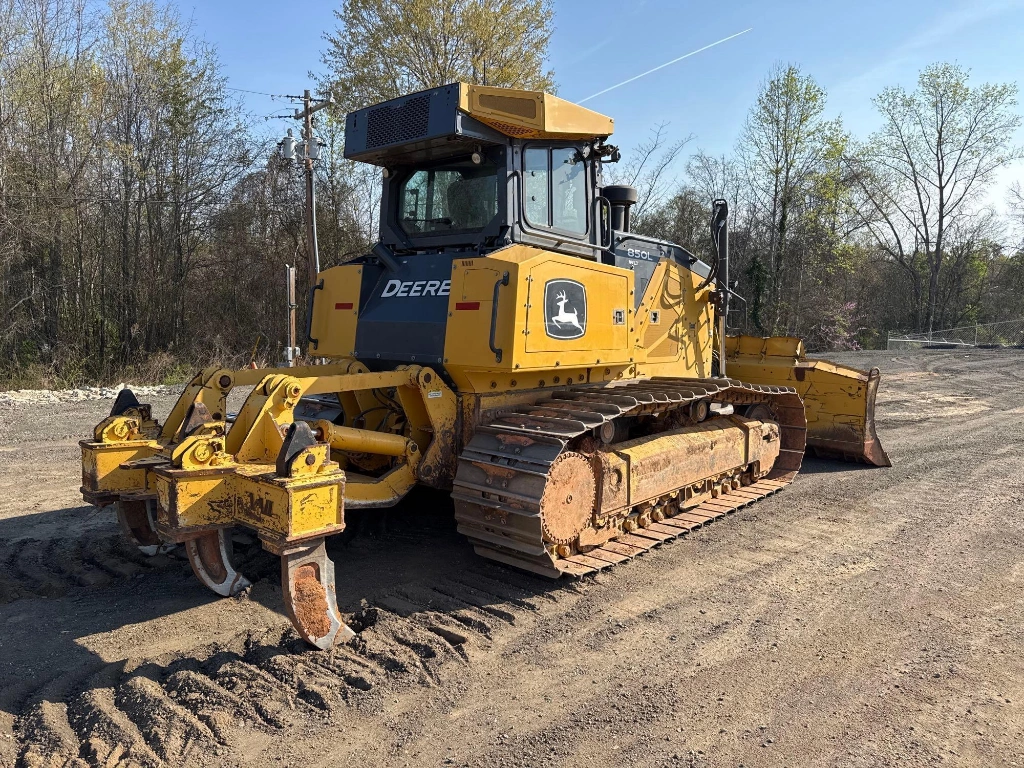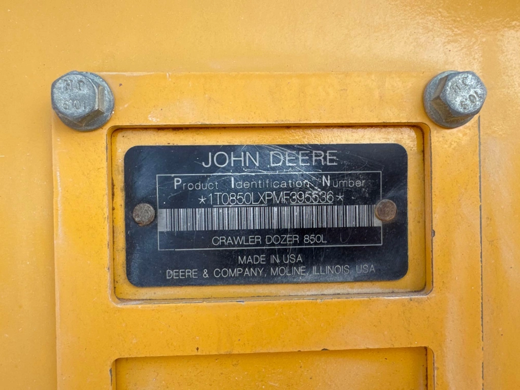 This 2021 John Deere 850L crawler dozer is identified by product identification number 1T0850LXPMF395536. Based on market consensus and physical branding, this unit features an enclosed cab with integrated Roll-Over Protective Structure (ROPS) and is powered by a John Deere diesel engine. The machine is equipped with a heavy-duty front-mounted dozer blade and a rear-mounted three-shank ripper assembly. It is constructed of steel with a yellow factory finish and is mounted on a track-type undercarriage. Markings include the John Deere logo and the 850L model designation on the side panels and rear. The identification plate specifies the manufacturer as Deere and Company, Moline, Illinois, USA. No hour meter reading was visible in the provided imagery; therefore, operating hours cannot be verified.